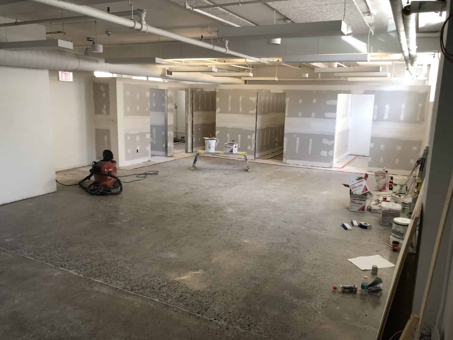 The scope began with in-house design and drafting, followed by strategic demolition preparing the space for new partition walls. Five private offices, a boardroom, executive office, reception, and collaborative zones were constructed using baseboard-less reveal bead detailing, acoustic insulation, and clean, contemporary drywall applications.