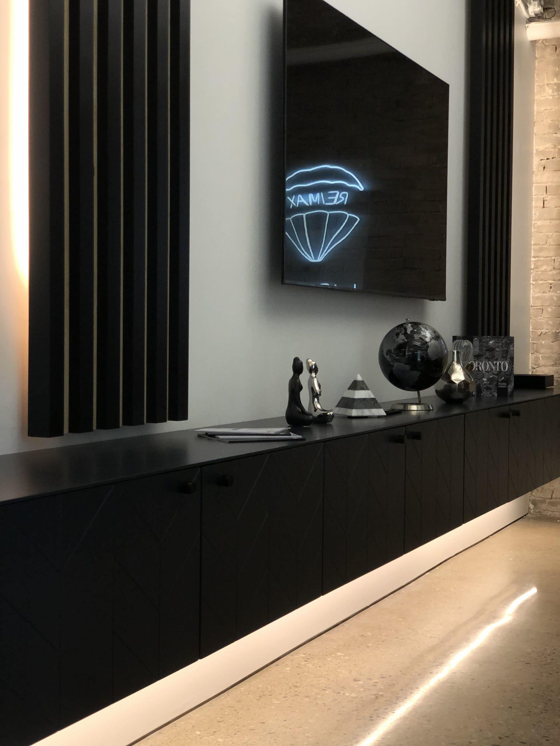To support visual continuity and branding, window frames were painted black and a custom 16-foot millwork credenza was fabricated for the boardroom. All workspaces were equipped with modern power and lighting solutions tailored for both functionality and aesthetics. By combining efficient construction management with tailored interior detailing, V2R Group delivered a high-performance office space that reflects RE/MAX’s market leadership and modern values.